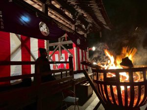 愛宕さんならではの珍しい儀式で、熱湯の中に笹をつけ、その湯をかぶるとその年は風邪をひかないという、大変激しく珍しい儀式です。夜には舞姫さんによるご祈祷が行われました。