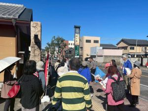雲一つない秋の晴天に恵まれ、じゃらんを通じ伊賀ぶらり体験博覧会(いがぶら)にお申し込みをいただいた15名の皆さんとスタッフも合わせて総勢24名で伊賀鉄道茅町駅から上野南部地区の史跡散策へ出発しました。