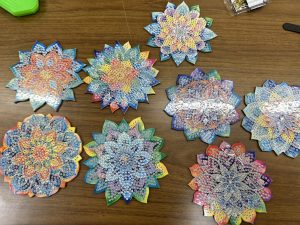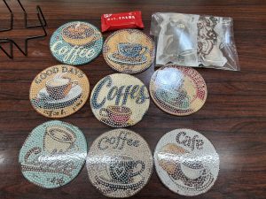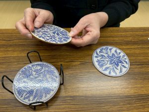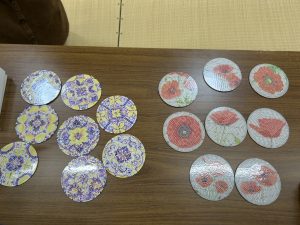 急遽新たにコースターを取り寄せ、今日は追加教材として制作していただきました。1つずつ違うコースターを購入し、抽選で制作作品を決定する「わくわくどきどき企画」を実施。番号くじで自分の作品が決まるという、少し趣向を凝らした内容にしました。